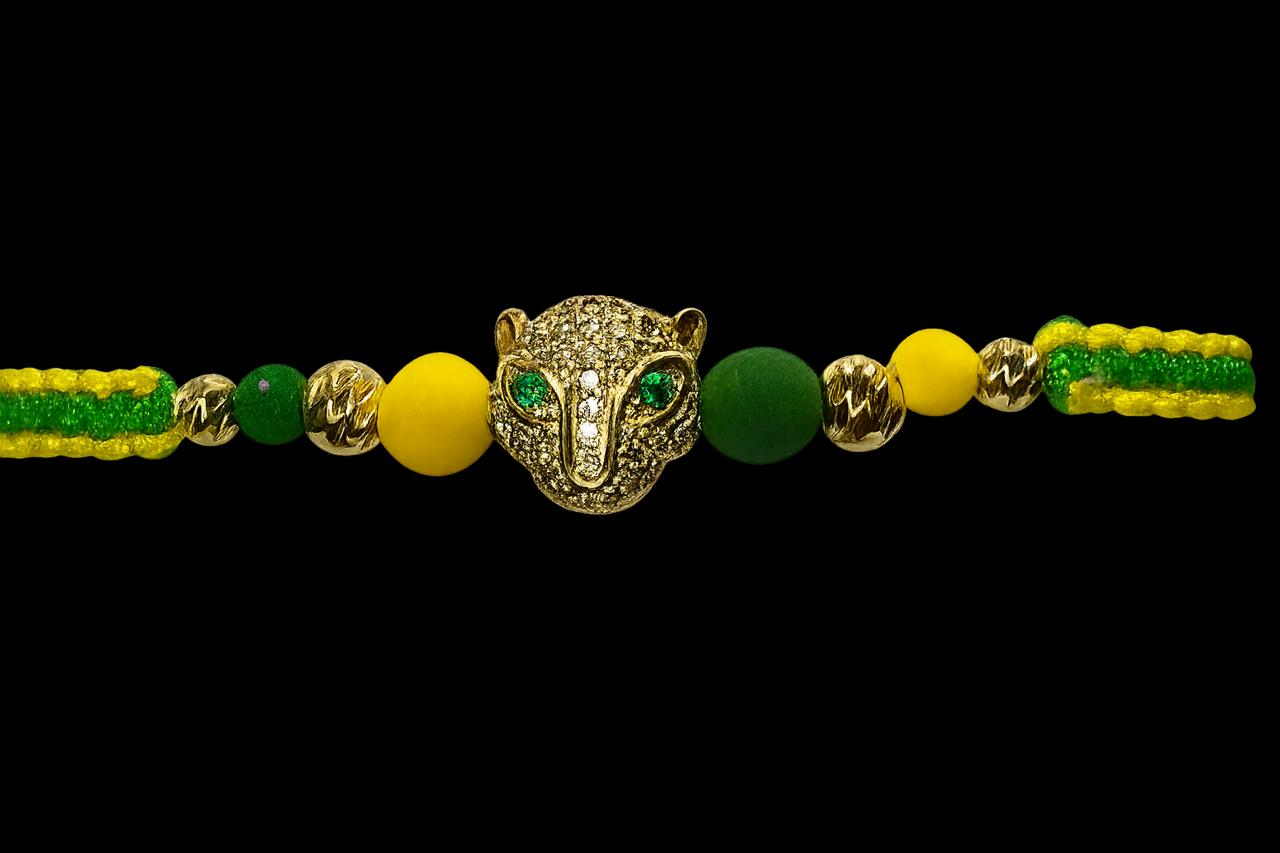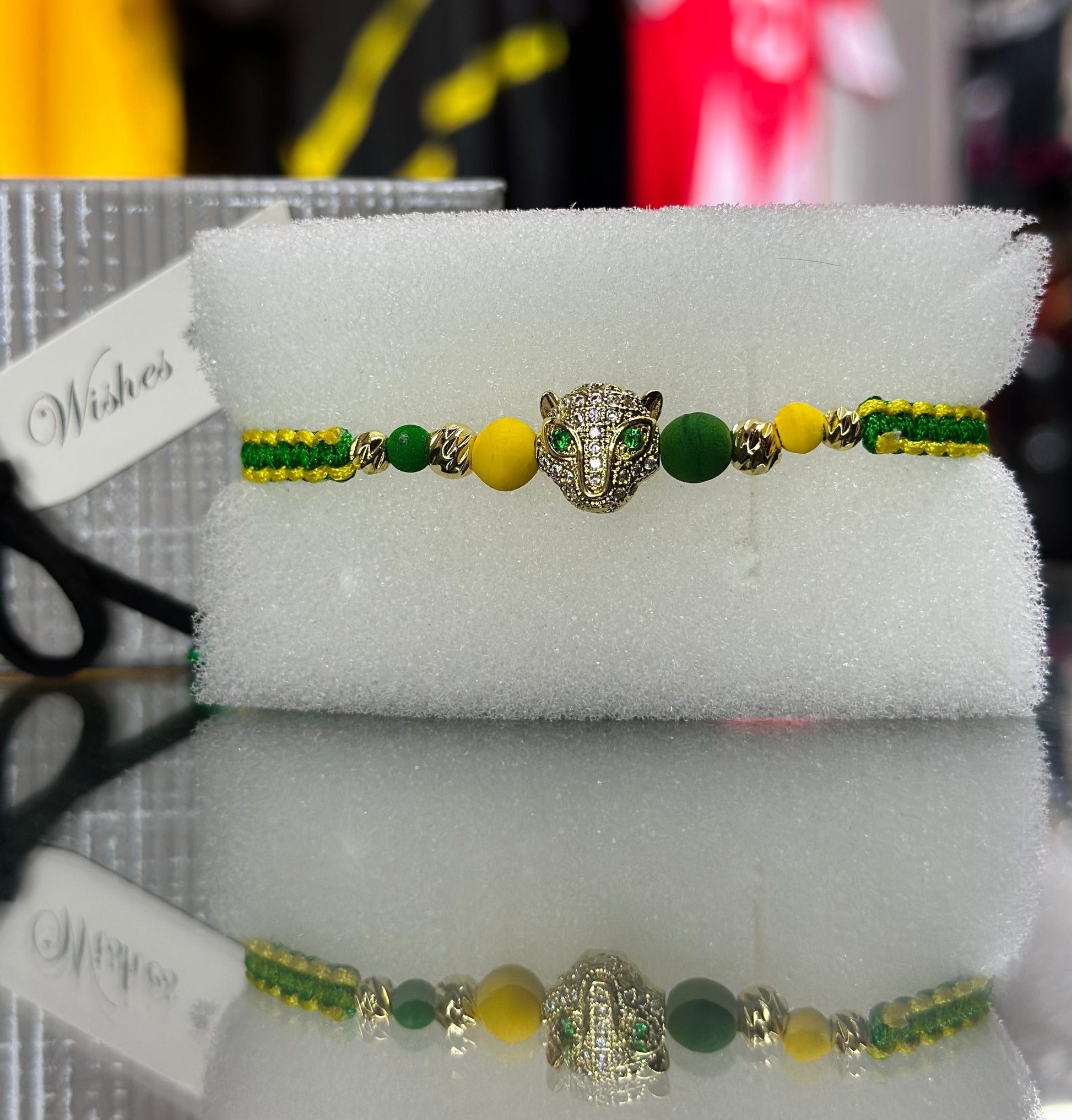 Cada pieza está inspirada en los colores del equipo —verde, amarillo y negro— con detalles dorados y un dije central en forma de leopardo incrustado en cristales, símbolo de fuerza y orgullo santandereano.