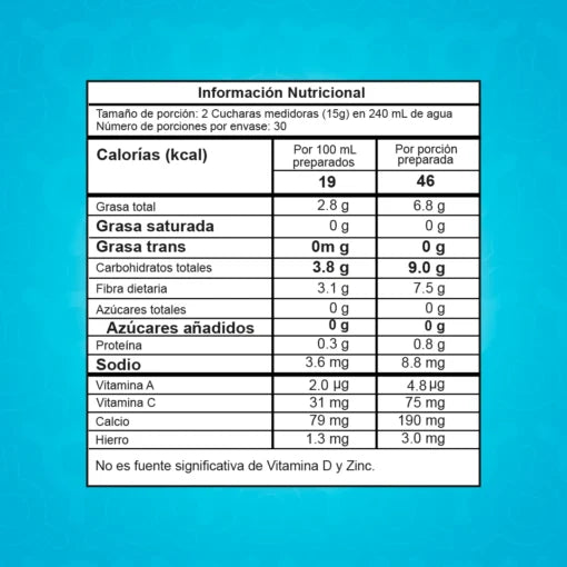 - Fibra Natural: Manzana, espinaca, brócoli, kale y coliflor en polvo.