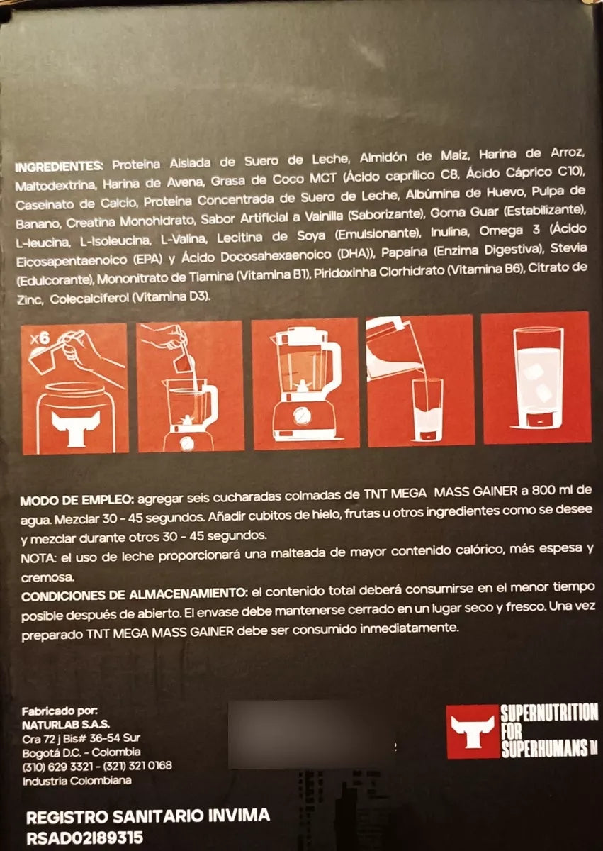 TNT es líder en el mercado por sus grandiosos componentes. Además de sus 81g de proteína por servicio, tiene más de 200 gramos de carbohidratos de diferentes fuentes, y 3 gramos de creatina monohidrato. Finalmente, su fórmula exclusiva contiene 70mg de las más avanzadas enzimas digestivas. TNT es, sin duda alguna, la reina de las hipercalóricas. Proteina tntTNT Mega Mass Gainer suplemento ideal para quienes buscan aumentar su peso y masa muscular de manera efectiva. Con un alto contenido de proteínas y carbohidratos, este gainer está formulado para proporcionar las calorías necesarias para la hipertrofia muscular.Descripción del ProductoTNT Mega Mass Gainer es un alimento a base de proteína de suero de leche, enriquecido con carbohidratos simples, vitaminas, minerales, aminoácidos y enzimas digestivas. No contiene azúcar añadida y ofrece 1290 calorías por porción cuando se disuelve en agua. Su excelente textura y delicioso sabor a vainilla lo convierten en el suplemento perfecto para consumir después del entrenamiento.