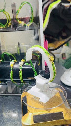 Cada pieza está inspirada en los colores del equipo —verde, amarillo y negro— con detalles dorados y un dije central en forma de leopardo incrustado en cristales, símbolo de fuerza y orgullo santandereano.